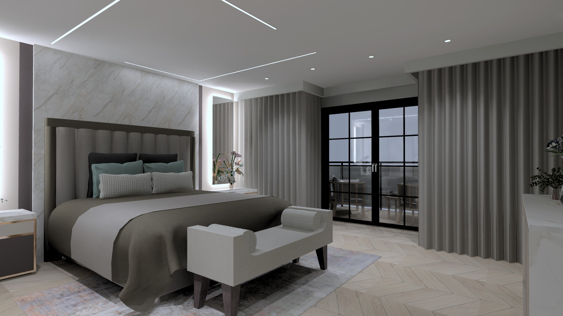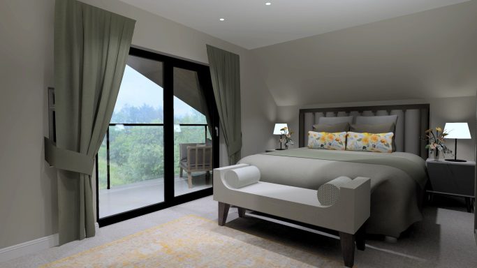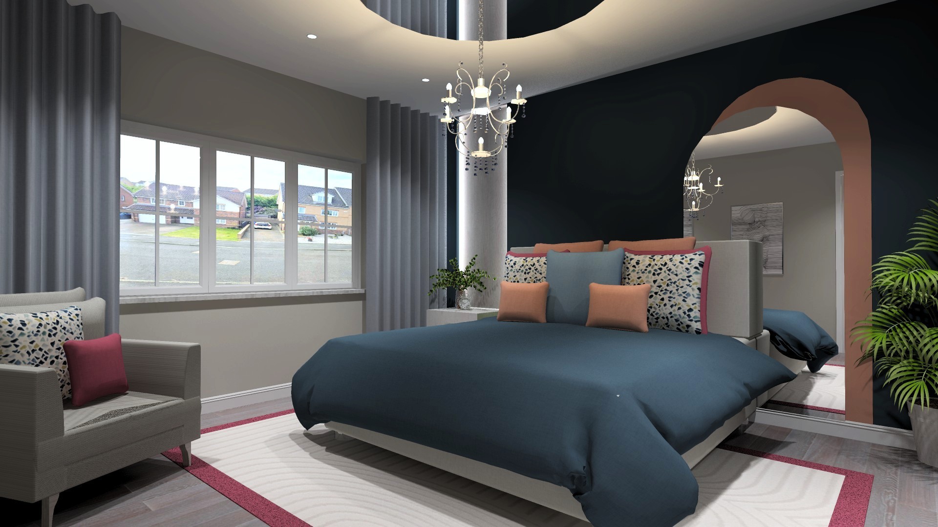Bedroom design by LG. Wall to wall curved curtains, cushions, and headboard made and supplied by JSF, as well as artwork and light fittings.