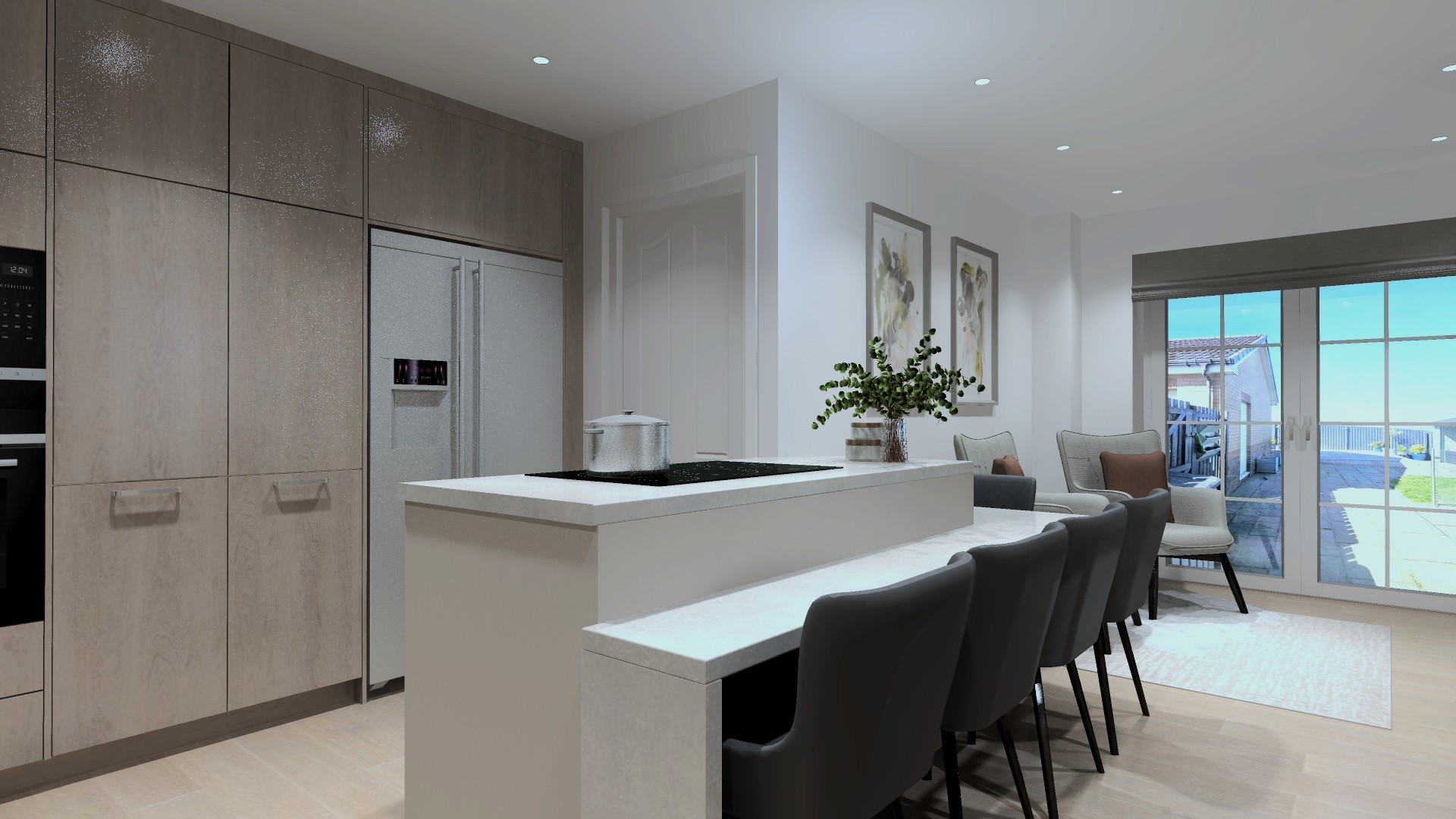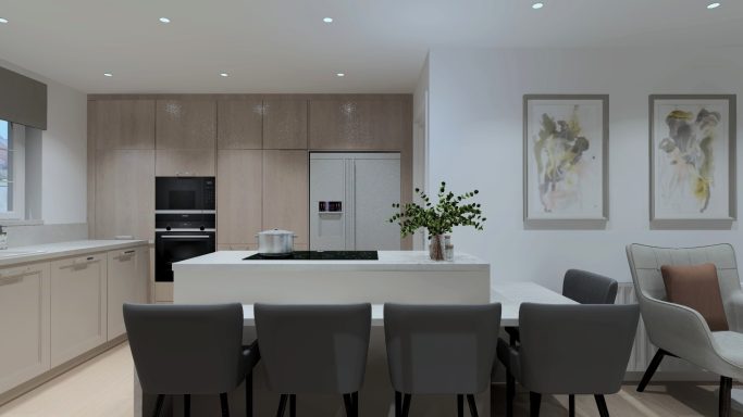 Kitchen design by LG. Joint project, working with kitchen designer and fitter. JSF supplying window fittings, artwork and light fittings.